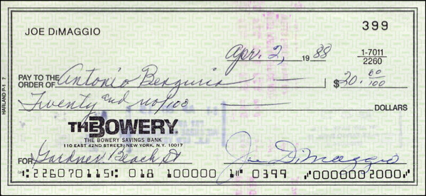 Personal check, 6 x 2.75, filled out in another hand and signed by DiMaggio, payable to Antonio Benguria for $20.00, April 2, 1988. In fine condition, with several stamps on reverse with some very light show through from one affecting a couple letters of signature. COA Steve Grad/PSA/DNA and R&R COA.
