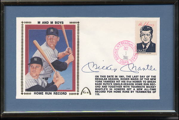 Gateway commemorative cover, bearing a silk cachet honoring Mantle and Roger Maris, signed on the front in ballpoint by Mantle. Matted and framed to an overall size of 8 x 5.5. In fine condition. COA Steve Grad/PSA/DNA and R&R COA.