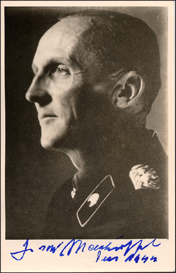 German Panzer general in WW II, a military strategist whose skillful and imaginative deployment of tanks repeatedly thwarted Allied offensives. Impressive 3.5 x 5.5 cardstock photo, signed in fountain pen, “H. v Manteuffel, Jun 1944.” In fine condition. R&R COA.