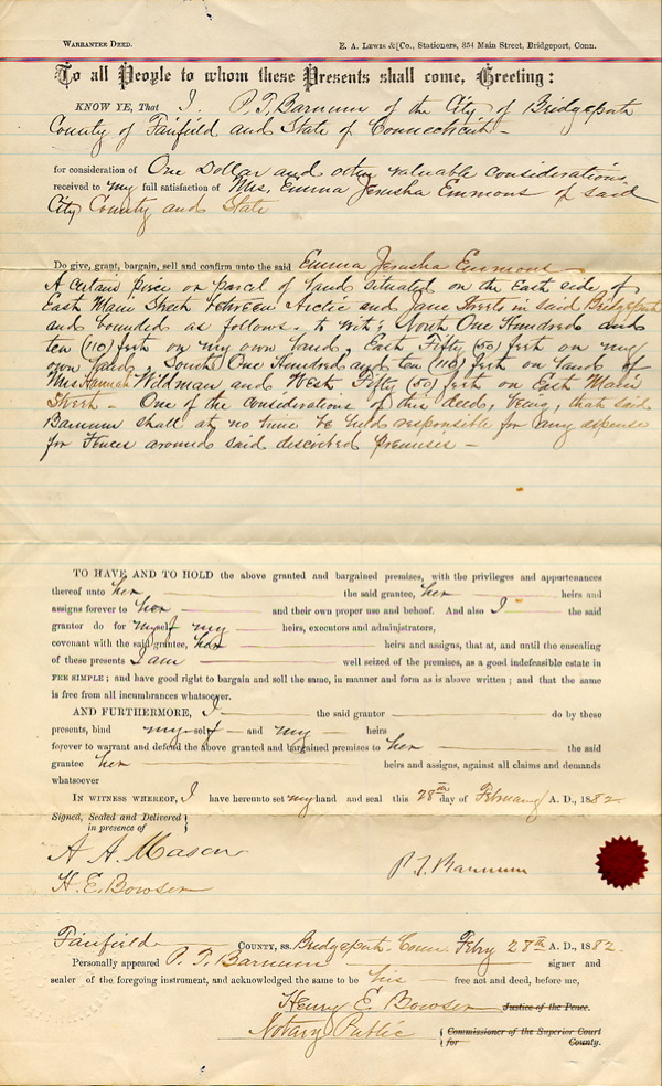 Flamboyant showman whose exotic exhibits included midget Tom Thumb, Swedish Nightingale Jenny Lind, and the counterfeit Feejee Mermaid. DS, one page, 8.5 x 14, February 28, 1882. Barnum sells a tract of land in Bridgeport, Connecticut to Emma Jerusha Eummous for the sum of one dollar “and other valuable considerations.” Signed at the bottom in fountain pen “P. T. Barnum.” In fine condition, with horizontal storage folds, some mild toning and intact seal. R&R COA.