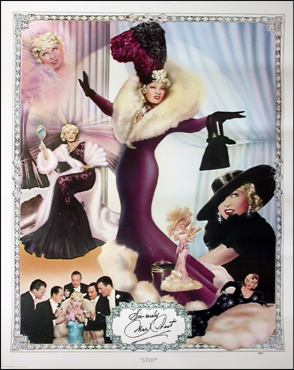 Beautiful full-color artist’s proof 24 x 30 lithograph; a great collage of film scenes boldly signed “Sin-cerely, Mae West” in black felt tip. In fine condition. Printed date 1978. R&R COA.