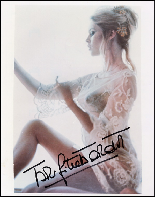 Alluring color satin-finish 8 x 10 photo of Bardot in a see through lace gown, signed in black felt tip. In fine condition. R&R COA.
