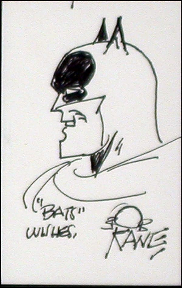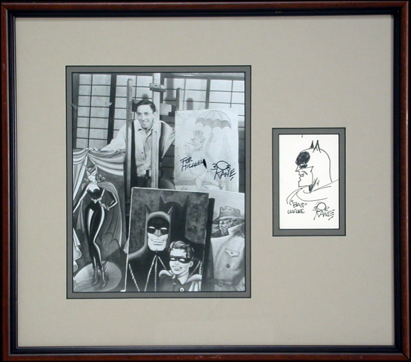 Very nice original ink sketch of Batman in profile, signed “‘Bats’ wishes, Bob Kane,” and an 8 x 10 photo of Kane surrounded by his artwork, signed and inscribed in black felt tip “For Michael!, Bob Kane.” Both are double matted and framed to an overall size of 17 x 15.5. In fine condition. R&R COA.