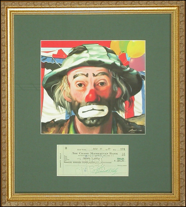 Personal check, 6 x 2.75, filled out in type and signed by Kelly, payable to Emmett Kelly for $150.00, July 30, 1957. Matted and framed with a colorful portrait of Weary Willy, to an overall size of 16 x 18. Cancellation holes affecting first name of signature and a crossed-out typo, otherwise fine condition. R&R COA.
