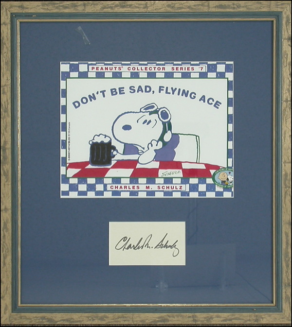 Felt tip signature, “Charles M. Schulz,” on an off-white card. Matted and framed with a color book cover for Don’t Be Sad Flying Ace, to an overall size of 17.25 x 19. In fine condition. R&R COA.