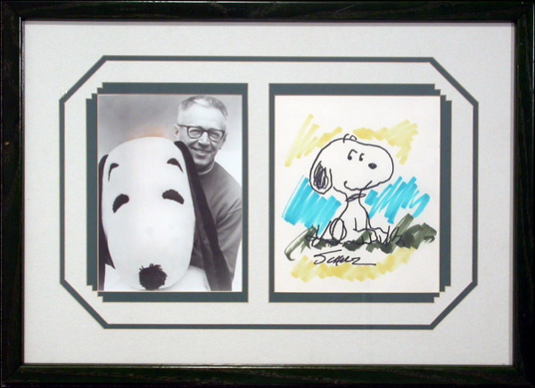 Original signed full bodied color felt tip sketch of Snoopy sitting in the grass on an off-white 8 x 10 sheet, signed at the bottom “Schulz.” Double matted and framed with a photo of Schulz, to an overall size of 24.75 x 18. In fine condition. R&R COA.
