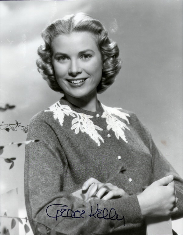 Lovely glossy 8 x 10 photo of Kelly in a button-up sweater, nicely signed in black felt tip, “Grace Kelly.” Matted to an overall size of 11.75 x 13.75. In very good condition, with scattered light surface marks and impressions, not affecting signature. R&R COA.