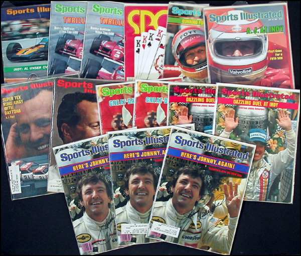 Lot of fifteen signed magazines, almost all Sports Illustrated, each sigend on the cover in felt tip by the respective driver pictured. Signers are: A. J. Foyt (5), Danny Sullivan (2), Al Unser, Johnny Rutherford (5) and Cale Yarborough (2). Several have added inscriptions and several magazines are duplicates. In fine condition, with mailing labels and remnants to covers and some light handling wear. R&R COA.