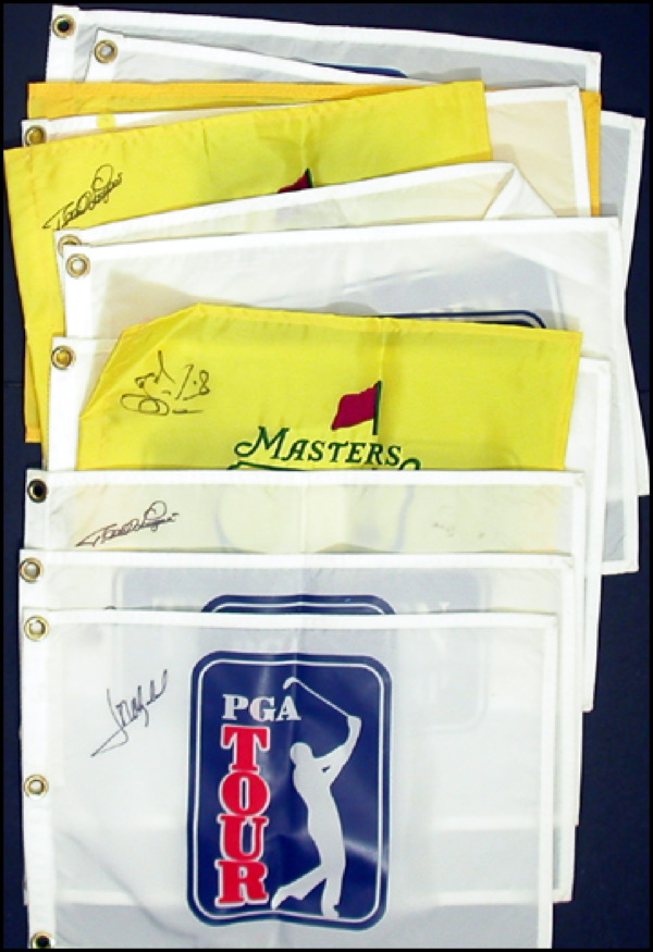 Lot of twelve PGA golf flags, from events including the Masters, British Open, each signed on the front in felt tip by a respective participant. Signers are: Olazabel, Azinger, Langer (2), Parnevik, Westwood, Leonard (2, one ins), Lehman (2), Montgomerie and Furyk. In fine condition. R&R COA.