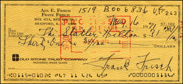 Played on more pennant winning teams than any other National League player. Personal check, 6 x 2.75, filled out and signed by Frisch, payable to The Statler Hilton for $31.34, May 16, 1971. In very good condition, with several vertical folds, cancellation stamp to body, lightly affecting beginning of signature and adhesive remnants to reverse. R&R COA.