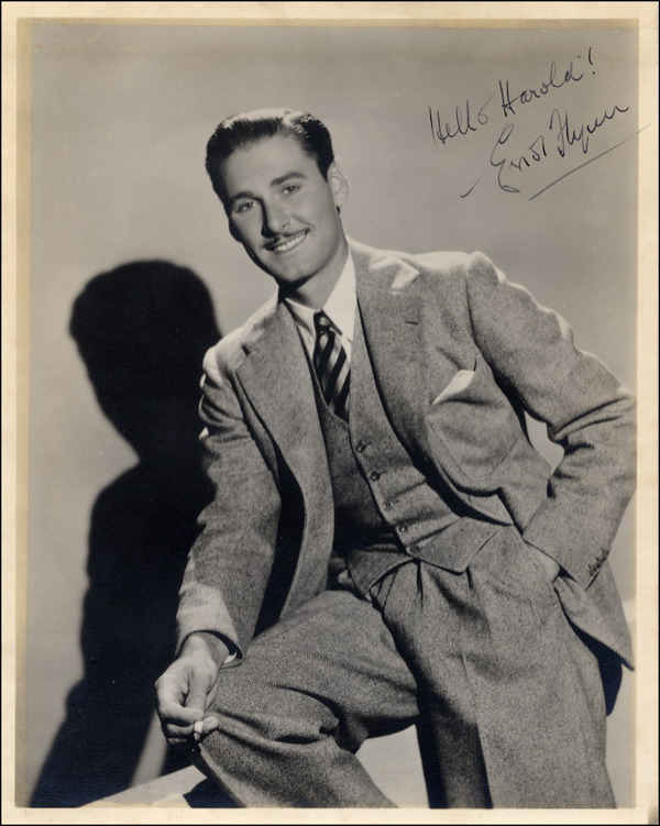 Vintage matte-finish 8 x 10 photo of Flynn in a three piece suit holding a cigarette, signed and inscribed in fountain pen “Hello Harold! - Errol Flynn.” In fine condition, with light border toning and a few spots of light silvering. R&R COA.