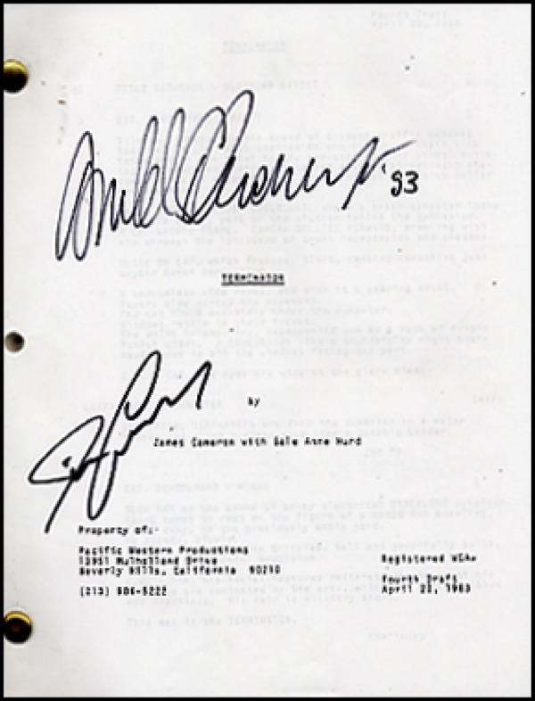 Complete copy of the 4th draft script for the film Terminator, dated April 20, 1983 and signed in-person in black felt tip on the front cover by both Arnold Schwarzenneger and writer/director James Cameron. In fine condition. R&R COA.