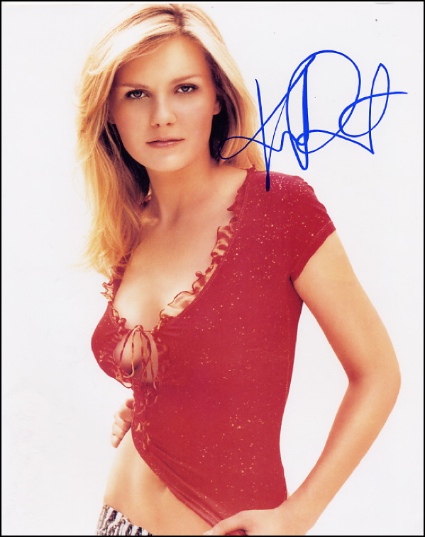 Amazing color glossy 8 x 10 portrait of Dunst in a cleavage-revealing red top, signed in-person in blue felt tip. In fine condition. R&R COA.
