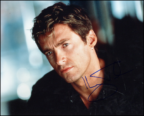 Color glossy 10 x 8 portrait of Jackman looking thoughtful in short hair and an earring, signed in-person in blue felt tip. In fine condition. R&R COA.