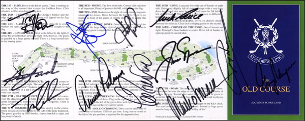 Souvenir scorecard from St. Andrew’s Links Old Course, measures 13.5 x 5.25 unfolded, signed in felt tip by twelve of golf’s best, all British Open Winners: Jack Nicklaus, Arnold Palmer, Tom Watson, Sam Snead, Lee Trevino, Gary Player, Greg Norman, Nick Price, Mark O’Meara, David Duvall, Tom Lehman, and Justin Leonard. In fine condition. R&R COA.