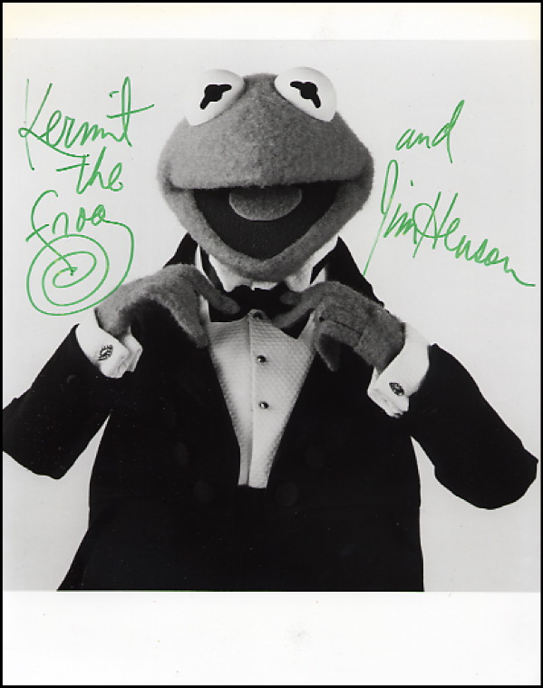 Glossy 8 x 10 photo of Kermit the Frog in a tuxedo, signed in green felt tip, “Kermit the Frog and Jim Henson.” In fine condition. R&R COA.