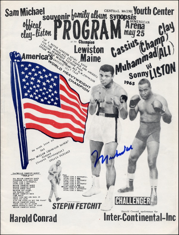 Unusual program, 8.5 x 11, 10 pages, a souvenir family album program from the Ali Liston fight in Maine in 1965, full of clipped articles and images of Ali in and out of the ring, as well as full page photos of Ali and Liston, with facsimile signatures done by Steppin Fetchit, who is featured throughout the program. Signed across the front cover in blue felt tip by Ali. Accompanied by a ticket stub from the 1995 signing where signature was obtained. In fine condition. COA Steve Grad/PSA/DNA and R&R COA.