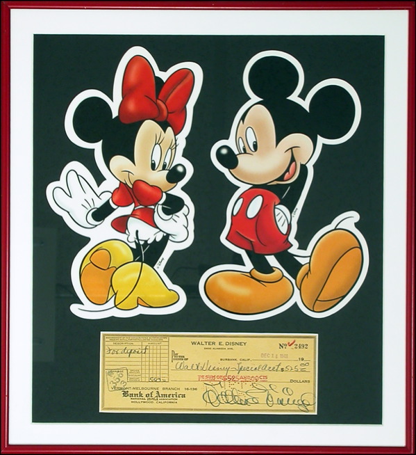 Personal check, 8.5 x 3.25, filled out in another hand and signed by Disney, payable to Walt Disney Special Acct. for $525.00, December 14, 1948. Matted and framed with an image of Mickey and Minnie Mouse, to an overall size of 15.75 x 15. In fine condition, with cancellation holes over most of letters of first name of signature, a red notation to top right and a couple of bank stamps. COA Phil Sears and R&R COA.