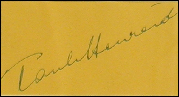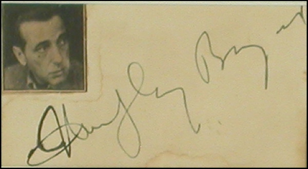 Fountain pen signature of Humphrey Bogart on an off-white album page, fountain pen signature of Paul Henreid on a yellow album page and an ink signature of Ingrid Bergman on a light blue album page. All three are double matted and framed with a small photo from the film and a color reproduction of the film’s poster, to an overall size of 24 x 15. In fine condition, with some light toning and spotting to Bogart’s signature, as well as a small clipped photo of Bogart affixed to the page. PSA/DNA COA and R&R COA.