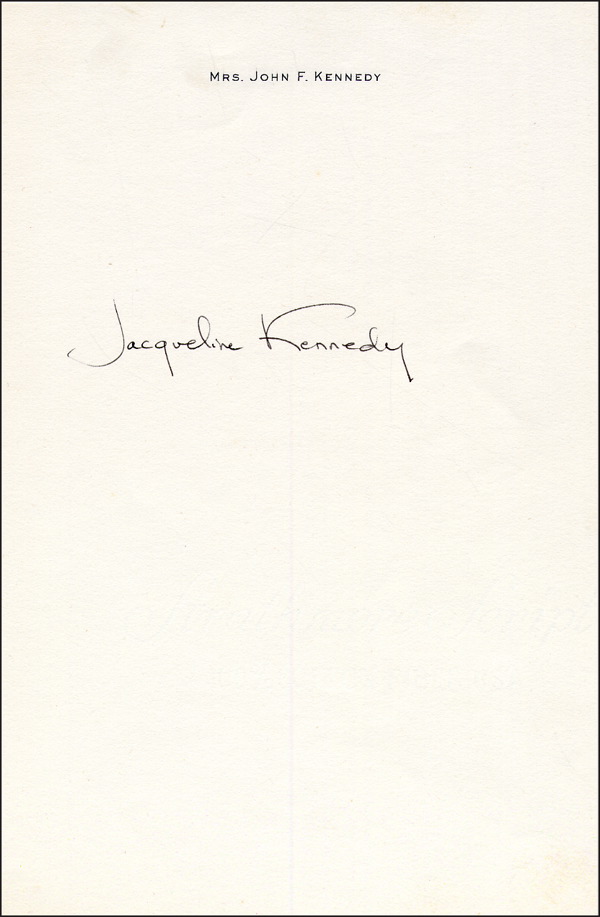 Ink signature, “Jacqueline Kennedy,” on an off-white 6 x 9 sheet of her personal Mrs. John F. Kennedy stationary. Accompanied by an April 3, 1967 TLS from Kennedy’s secretary, Pamela Timmins, to the Chairman of the Graphic Arts Department of New York City Community College, acknowledging the signature on the stationary and a color JFK mourning card. In very fine condition. COA John Reznikoff/PSA/DNA and R&R COA.