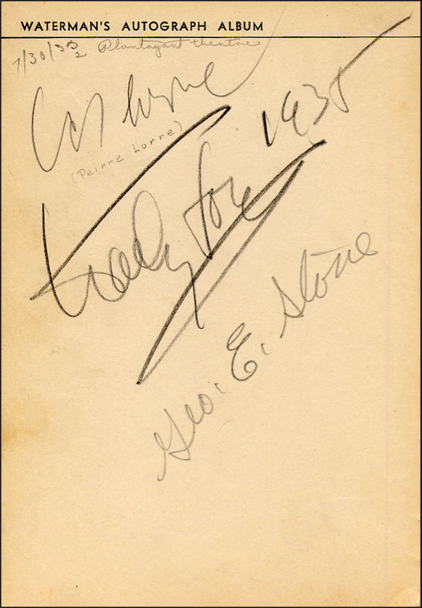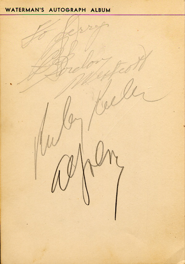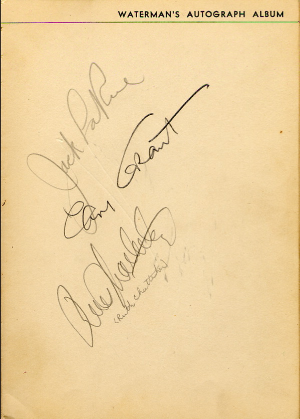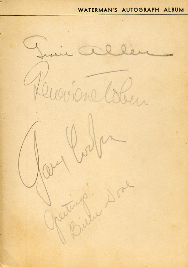 For six months in the early 1930s — April 1 to October 1, 1932 — the Waterman fountain pen company ran a contest for boys and girls. Each entrant was to fill a 5 x 7.25 autograph album with signatures of notables of the day and send it to the company to qualify for a prize. An array of 333 prizes were given away, from the $1000 first prize to the Waterman’s pencil for runners up. Waterman’s autograph album, 5 x 7.25, a young man from Santa Monica, California named Jerry Houghton III, signed inside in pencil by 34 celebrities, including: James Dunn, Randolph Scott. Elizabeth Allen, Peter Lorre, Steppin Fetchit, Edward Arnold, Ruby Keeler, Al Jolson, Cary Grant, Jack LaRue, George O’Brien, Alice Faye, Gary Cooper and Billie Dove. In fine condition, several collector’s notations and spine a touch weak. R&R COA.