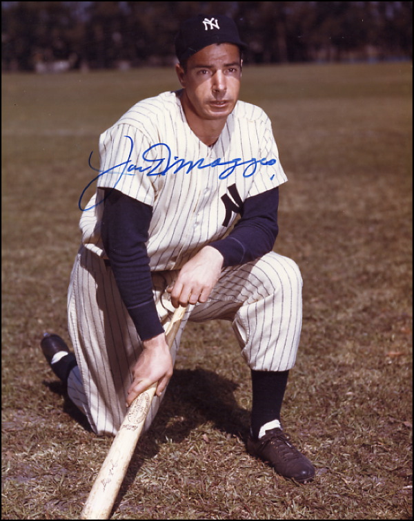 Excellent color satin-finish 8 x 10 photo of DiMaggio taking a knee, signed in blue felt tip. In fine condition. COA Steve Grad/PSA/DNA and R&R COA.