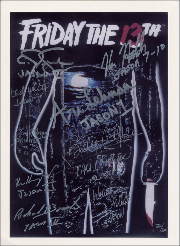 Excellent quality color glossy 8 x 11 photo of a spooky scene incorporated into a silhouette-like image of Jason holding a knife, limited edition 26/30, signed in silver ink by every actor who has played the Jason character in all eleven films: Ari Lehman, Warrington Gillette, Richard Brooker, Ted White, Tom Morga, C. J. Graham, Kane Hodder, and Ken Kirzinger. Also signed by Betsy Palmer, who played Mrs. Vorhees, the killer in Part 1. In excellent condition. R&R COA.
