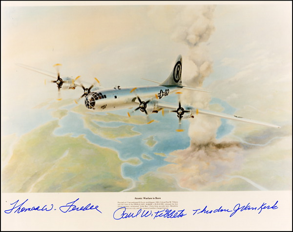 Beautiful color satin-finish 10 x 8 photo of a print of the Enola Gay in flight, entitled “Atomic Warfare is Born,” signed at the bottom in blue felt tip by Paul Tibbets, Theodore Van Kirk, and Thomas Ferebee. In excellent condition. R&R COA.