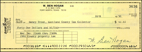 Personal check, 8.25 x 3, filled out in type and signed by “W. Ben Hogan,” payable to Nancy Trout, Eastland County Tax Collector for $41.81, October 8, 1991. In fine condition, with cancellation stamps on reverse only. R&R COA.