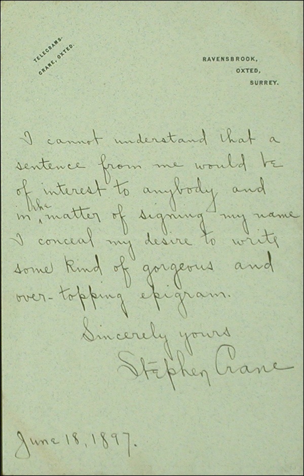 Author of The Red Badge of Courage and Maggie: A Girl of the Streets, he also served as a war correspondent in Cuba and Greece, experiences he drew on when crafting his famous short story The Open Boat. Very rare ALS, one page, 4.5 x 7, Ravensbrook letterhead, June 18, 1897. Letter to an unknown recipient. In full, “I cannot understand that a sentence from me would be of interest to anybody and in the matter of signing my name I conceal my desire to write some kind of gorgeous and over-topping epigram.” Archivally double suede matted and framed with a portrait of Crane, to an overall size of 17.5 x 14. In fine condition, with a bisecting horizontal fold and a trivial strip of toning through a letter of date at bottom left. COA John Reznikoff/PSA/DNA and R&R COA.