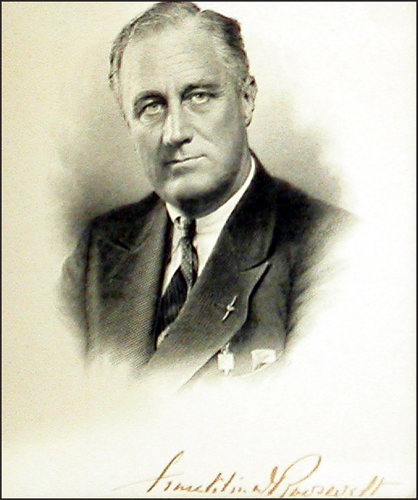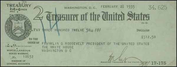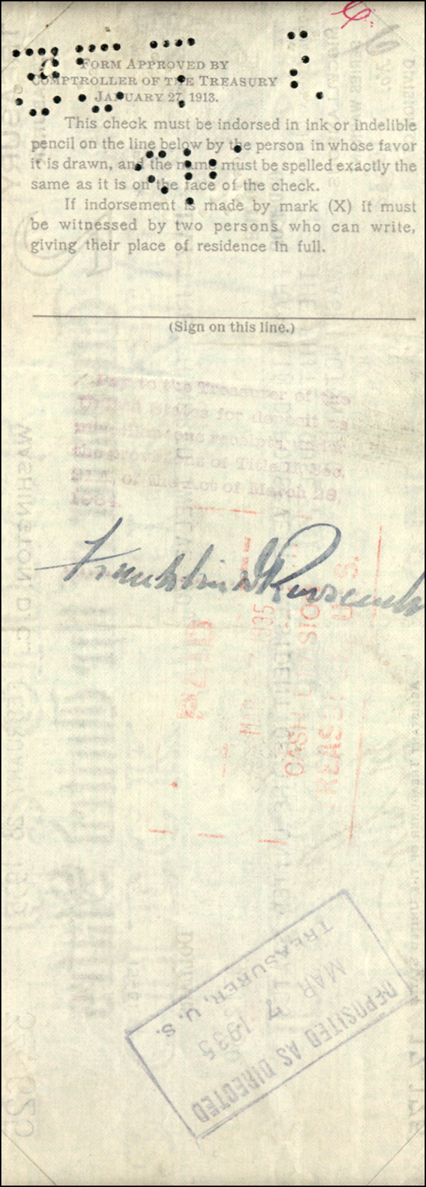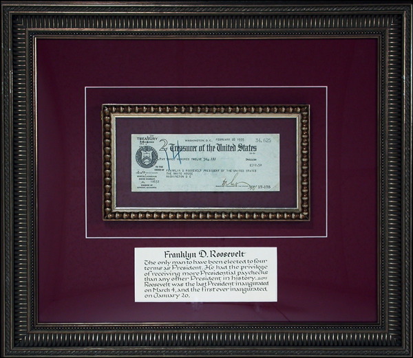 Rare presidential check, 8.25 x 3.5, filled out in type and endorsed by Roosevelt, payable to Franklin D. Roosevelt, President of the United States for $312.50, February 28, 1935. Check is mounted and framed to a hinged frame measuring 11.5 x 7, which is in turn affixed to a double matted and framed, signed engraved portrait of Roosevelt and a small plaque, to an overall size of 23.5 x 20.5. Pencil mark to front of check, bisecting vertical fold, cancellation holes to edge and a bold endorsement, otherwise fine condition. Presidential paychecks seldom appear on the market. COA John Reznikoff/PSA/DNA and R&R COA. Oversized.