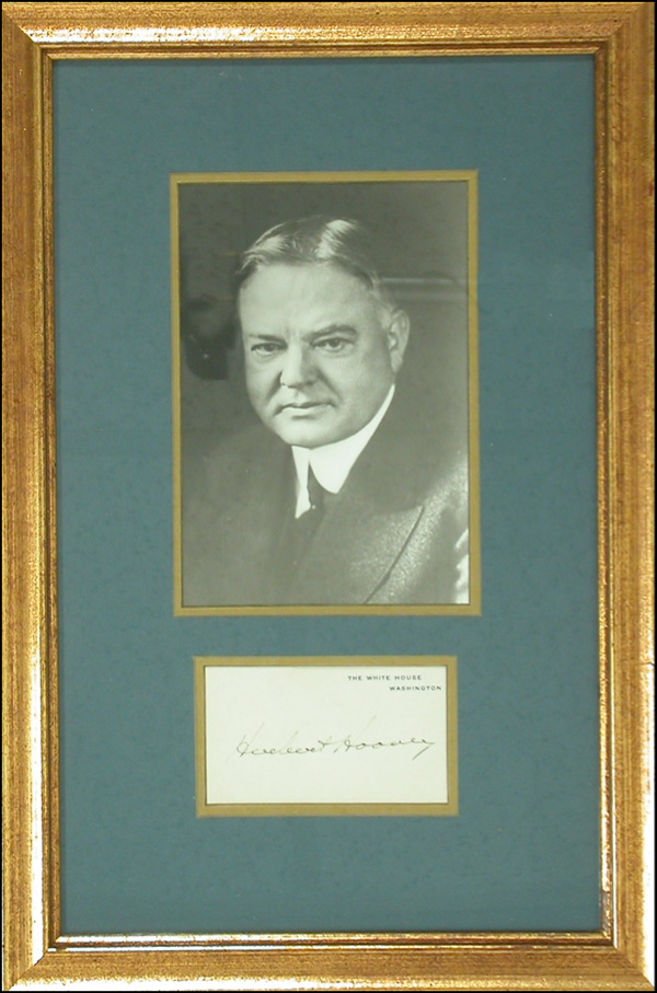 Signed 4 x 2.75 White House card, signed in fountain pen “Herbert Hoover.” Double matted and framed with a photo of Hoover, to an overall size of 11 x 16.5. In fine condition. R&R COA.