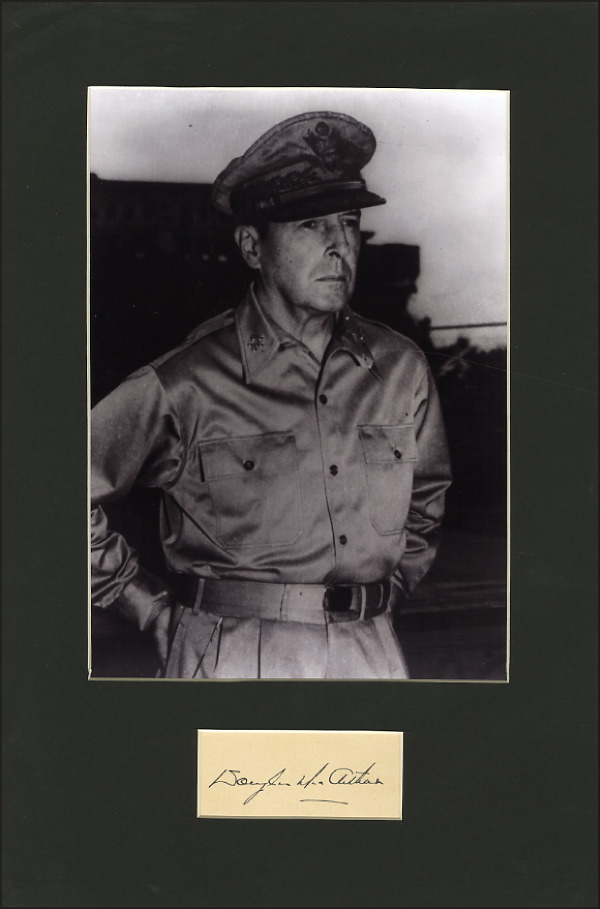Ink signature, “Douglas MacArthur,” on an off-white card. Matted with a nice photo of MacArthur, to an overall size of 10 x 15. In fine condition. R&R COA.