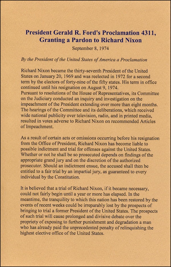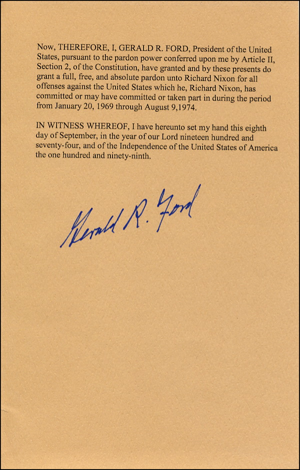 Souvenir typescript of the Nixon pardon, on two gold 5.75 x 9 sheets, signed on the second page “Gerald R. Ford” in blue felt tip. This transcript includes five paragraphs of the historic pardon. In part: “I, Gerald R. Ford, President of the United States…do grant a full, free, and absolute pardon unto Richard Nixon for all offenses against the United States which he…may have committed or taken part in during the period from January 20, 1969 through August 9, 1974.” In very fine condition. R&R COA.