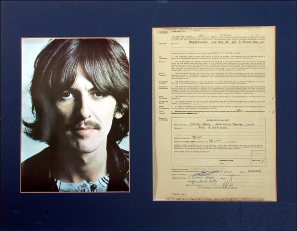 DS, one page, 8 x 11.5, September 29, 1972. Harrison orders one autophone for installation at Friar Park, agreeing to the 95 pound yearly price. Signed near the bottom in black ink by Harrison. Matted with a color photo, to an overall size of 20 x 15.5. In very good condition, with light overall toning to page, Harrison’s signature quite light but legible, several horizontal folds and mounting remnants to top and bottom edge. COA Roger Epperson/PSA/DNA and R&R COA.