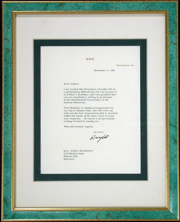 TLS signed “Dwight,” one page, 7 x 9.25, DDE letterhead, November 3, 1961. Letter to his brother’s widow. In part, “I am certain that November eleventh will be a particularly difficult day for you because it is Arthur’s birthday, and I am gratified you are nonetheless willing to participate in the Rededication Ceremonies of the Liberty Memorial. Tom Stephens…will work out with you the best compromise that is possible within the limits of the time I have to meet your requests.” Double matted and framed to an overall size of 12.5 x 15.5. In fine condition. R&R COA.