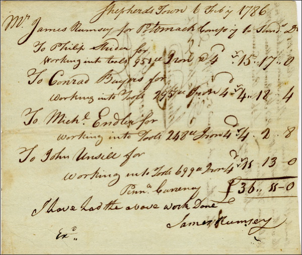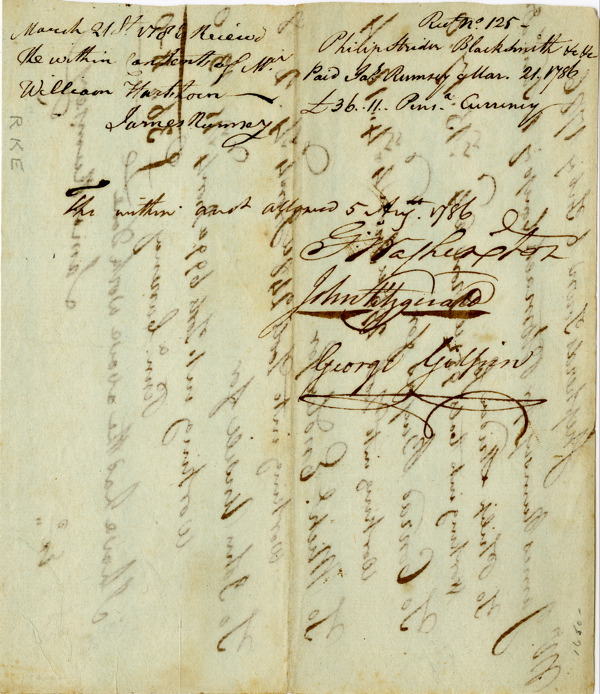 DS, signed “G. Washington,” one page both sides, 7 x 6, August 1786. Document reads, “Shepherds Town 6, Feb'y 1786. Mr James Rumsey for Potomack Comp. Is to send. D. To Philip Striden for working into tools 951 iron @ 4 15.17.0 to Conrad Buyers for working into tools 295 Iron 4 - 4.18.4 To Mich'l. Enlee for working into tools 248 Iron 4.2.8. To John Unsill for working into tools 699 Iron 15.13-0 Penna. currency L36.55-0 I have had the above work done. James Rumsey." One the reverse is a statement approving the bill which reads, "March 21st 1786 Rec'd. Philip Striden Blacksmith. The within content of Mr. William Harthorn. The within amt. Allowed 5, Aug. 1786. G. Washington." Also signed by John Fitzgerald and George Gilpin. In fine condition, with writing from opposing sides showing through. COA John Reznikoff/PSA/DNA and R&R COA.