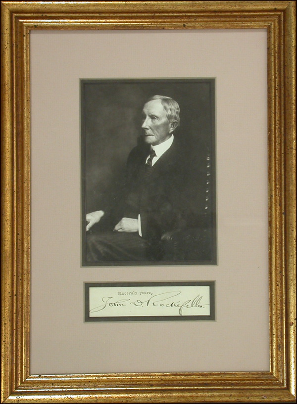 Entrepreneur who entered the oil industry at the age of twenty-four and worked ruthlessly to unify it into the Standard Oil Trust. Bold fountain pen signature, “John D. Rockefeller,” on an off-white slip, clipped from the closing of a letter. Nicely double matted and framed with a seated portrait of Rockefeller, to an overall size of 11 x 15. In fine condition. COA John Reznikoff/PSA/DNA and R&R COA.