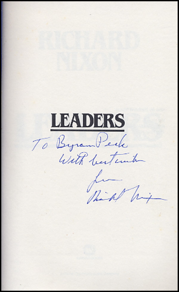 Signed book: Leaders. NY: Warner Books, 1982. Hardcover with dustjacket, 6.25 x 9.25, 371 pages. Signed and inscribed in blue ink on the half-title page to Bryan Peck. Accompanied by the original letter of request from the collector. In fine condition. R&R COA.