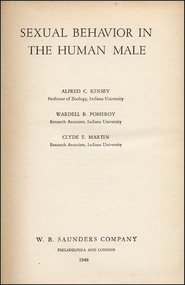 Zoologist and sexologist, author of the landmark Kinsey Report on Human Sexual Behavior. Signed book: Sexual Behavior In The Human Male. Philadelphia: W. B. Saunders Company, 1948. Hardcover, 6.25 x 9.25, 804 pages. Signed and inscribed in fountain pen on the first free end page “To Adele and Eddy Music, Alfred Kinsey 4.11.48.” In fine condition, with light overall page toning, with a heavier spot to signed page, some mild discoloration to cover and a bold signature. R&R COA.