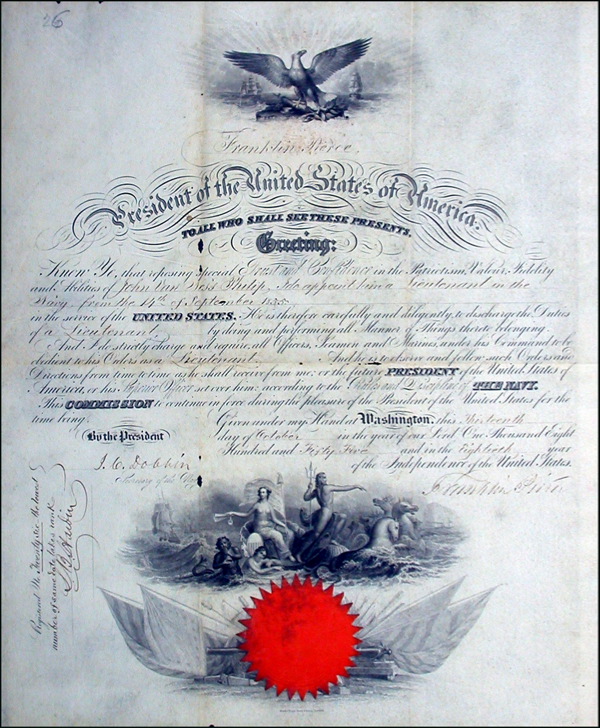 DS as president, one page, 14.5 x 17.75, October 13, 1855. President Franklin Pierce appoints John Van Ness Philip to the rank of Lieutenant in the Navy. Signed at the conclusion in black ink by Pierce and countersigned by Secretary of the Navy J. C. Dobbin. In very good condition, with heavy folds, some small areas of paper loss along one vertical fold, intact but worn seal and some light toning, none affecting signature. R&R COA.
