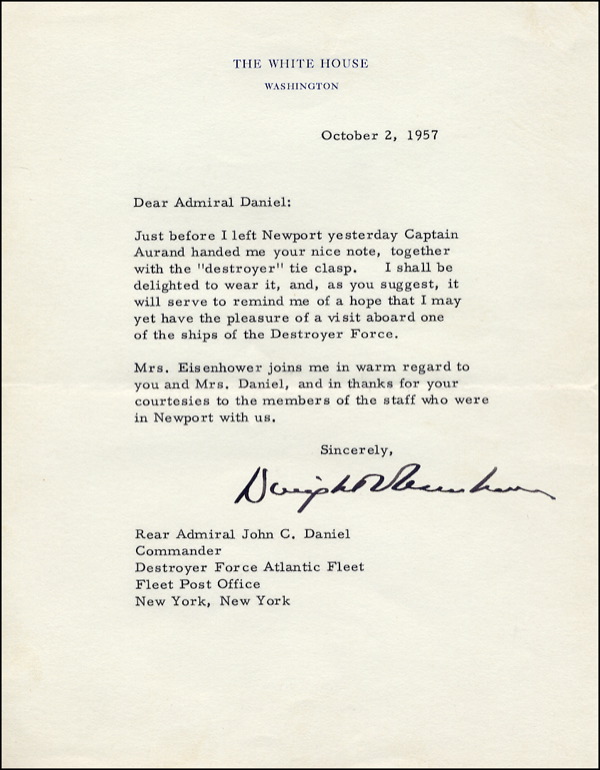 TLS as President, one page, 7 x 9, The White House, Washington letterhead, October 2, 1957. Letter to Admiral Daniel. In part: “Just before I left Newport Yesterday, Captain Aurand handed me your nice note, together with the ‘destroyer’ tie clasp. I shall be delighted to wear it, it will serve to remind me of a hope that I might yet have the pleasure of a visit aboard one of the ships of the Destroyer Force.” In fine condition, with faint edge toning. COA John Reznikoff/PSA/DNA and R&R COA.