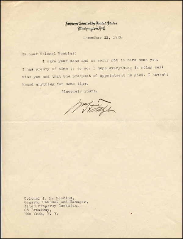 President and Chief Justice of the U.S. Supreme Court. TLS signed “Wm. H. Taft,” one page, 8 x 10.5, Supreme Court of the United States, Washington D.C. letterhead, December 22, 1924. In part: “My Dear Colonel Meekins: I have your note and am sorry not to have seen you. I had plenty of time to do so. I hope everything is going well with you and that the prospect of appointment is good. I haven’t heard anything for some time.” In fine condition, with light edge toning, a few scattered creases, two vertical folds, neither of which affect the signature. R&R COA.
