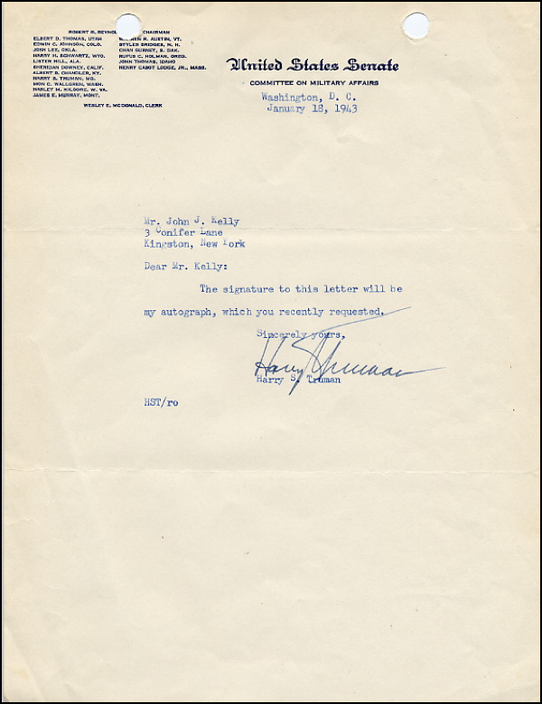TLS, one page, 8 x 10.5, United States Senate, committee on Military Affairs letterhead, January 18, 1943. In full: “Dear Mr. Kelly: The signature to this letter will be my autograph, which you recently requested.” In fine condition, with scattered faint creasing, light edge toning, two file holes to top border. R&R COA.