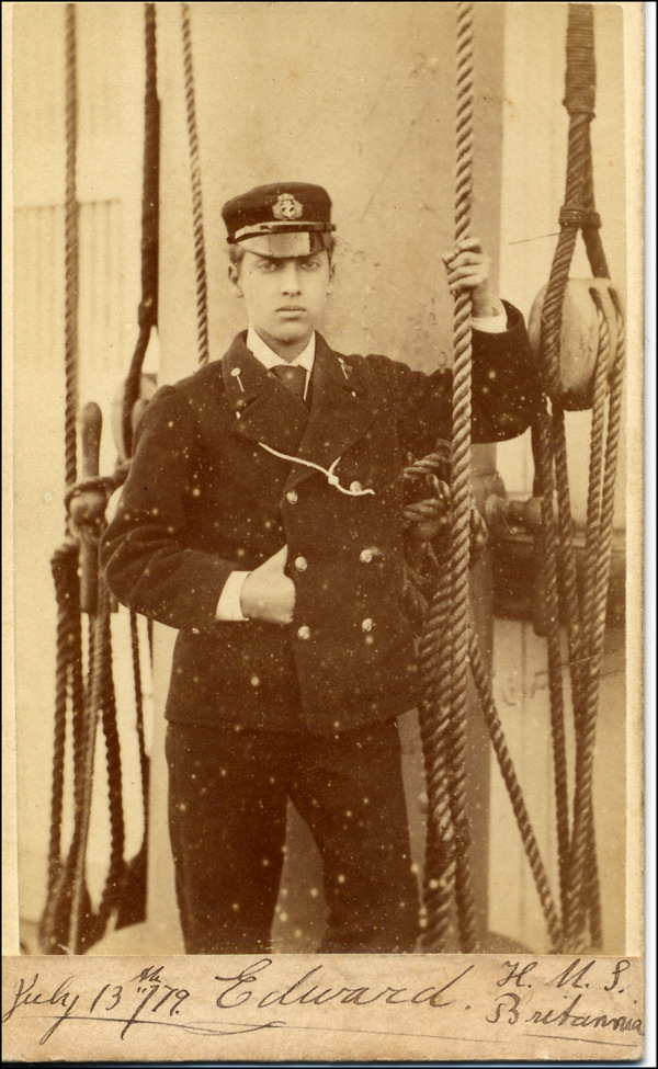 In recent times the Duke of Clarence and Avondale has been the center of rumors that he committed, or was responsible for, the Jack the Ripper murders in 1888. However, these theories have been comprehensively dismissed by reputable historians, who note, among other factors, that the Prince was in Scotland at the time of several of the murders. Vintage sepia 2.5 x 4 carte-de-visite photo of the fifteen year old prince aboard the Britainia, signed in fountain pen, “Edward,” with a date and notation done in another hand. In fine condition, with some scattered light spotting and toning. R&R COA.