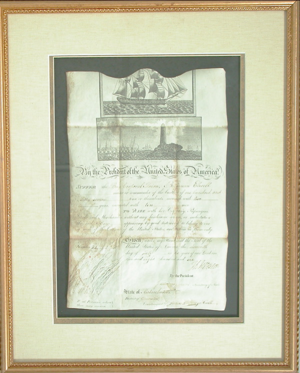 Scalloped-top vellum DS signed by Jefferson as president, “Th: Jefferson,” and Madison as Secretary of State, one page, 10 x 15.5, July 11, 1806. Ship’s pass issued to “the Brig Corporal Trim, Benjamin Elwell Master and Commander of the of Burthen One Hundred sixty seven tons or thereabouts, mounted with two guns, navigated with ten men to pass with her Company Passengers, Goods and Merchandise without any hinderence, seizure or molestation.” Double cloth matted and framed to an overall size of 19.5 x 24.5 In very good condition, with usual wrinkling, moderate staining to left side and along a couple of heavy folds, cancellation cut through small portion of Madison’s signature, removed seal resulting in some surface loss and discoloration. Jefferson’s signature isvery clear and quite bold. COA John Reznikoff/PSA/DNA and R&R COA. Oversized.