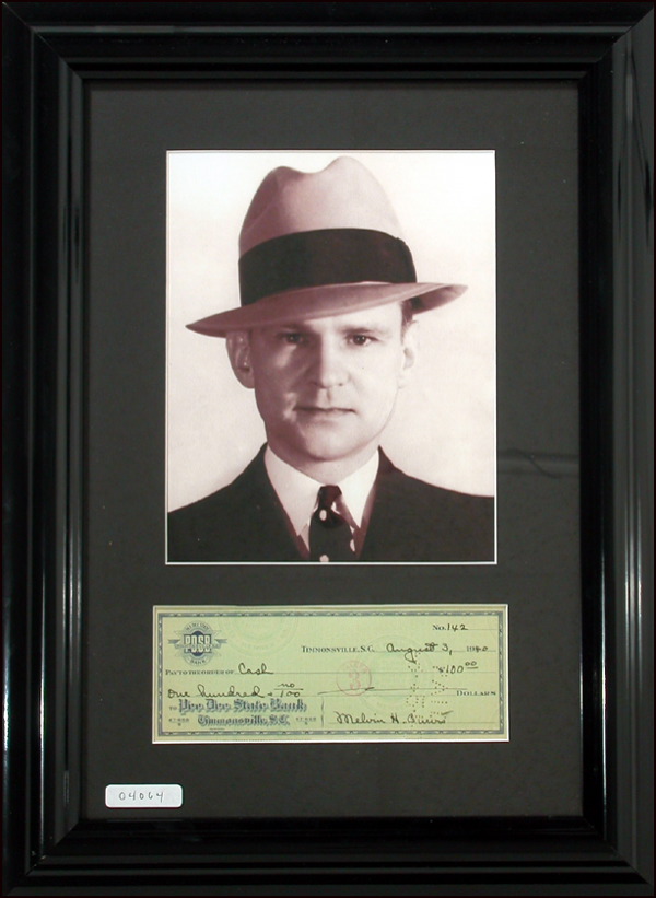 FBI agent responsible for the capture of John Dillinger, ‘Pretty Boy’ Floyd, ‘Baby Face’ Nelson, and others. Check, 15 x 21.5, filled out and signed by Purvis, payable to Cash for $100.00, August 3, 1940. Matted and framed with a photo of Purvis, to an overall size of 15.5 x 21. Bank stamp to center and cancellation holes affecting last name of signature, otherwise fine condition. R&R COA.