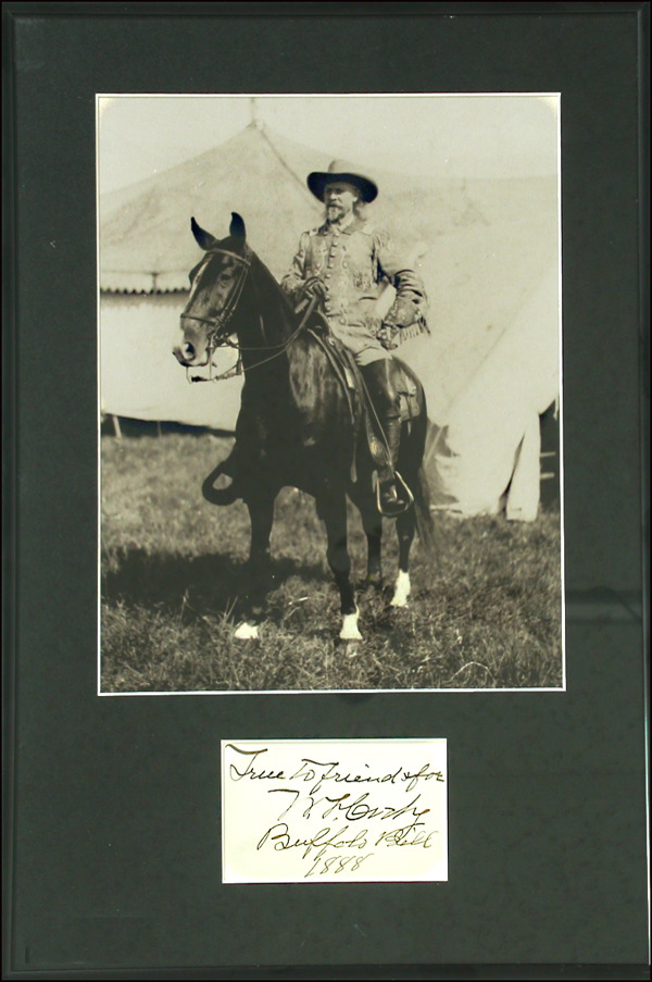Choice AQS on an off-white 3.5 x 2.25 card. In full, “True to friend & foe, W. F. Cody, ‘Buffalo Bill,’ 1888.” Matted and framed with a photo of Cody on his horse, to an overall size of 10.25 x 15.25. In fine condition. COA John Reznikoff/PSA/DNA and R&R COA.