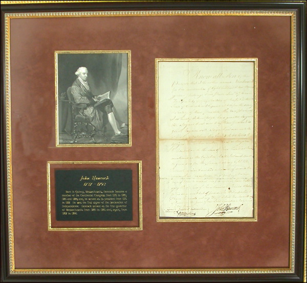 DS, one page, 7 x 12, June 7, 1784. Document, signed by Hancock as Governor of Massachusetts, concerning a financial matter. In part, “Know all men by these present that I the within named John Hancock for & in consideration of eight hundred & ten pounds eighteen shillings six pence…paid by Geofrey Hathbone…in the state of Connecticut…before the delivery & seating of these present,” with remainder of document spelling out financial particulars. Boldly signed at the bottom in black ink “John Hancock.” Gilt suede matted and framed with a seated portrait of Hancock and a biographical plaque, to an overall size of 24.5 x 23. In very good condition, with several repairs to horizontal separations, some scattered light paper loss and document having been partially professionally silked, with none of the flaws affecting clear and bold signature. COA John Reznikoff/PSA/DNA and R&R COA. Oversized.