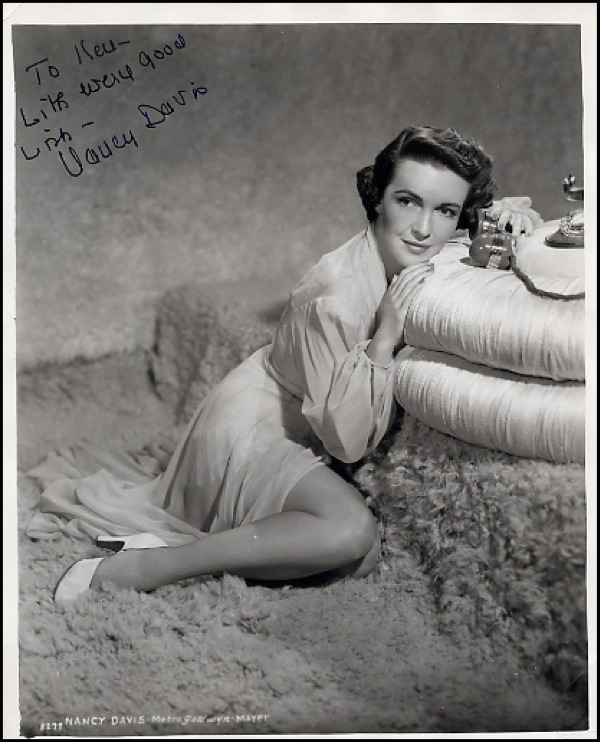 Vintage matte-finish 8 x 10 MGM publicity photo of the future Mrs. Reagan posing on a rug, signed and inscribed in fountain pen “To Ken, with every good wish, Nancy Davis.” Light rippling to top and bottom edge and a couple small corner creases, otherwise fine condition. R&R COA.